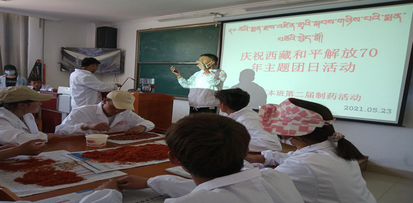 团日活动在《义勇军进行曲》的奏唱中拉开帷幕,国歌唱毕,全场肃立,向为西藏和平解放和社会主义革命与建设事业牺牲的烈士默哀。随后,18级团支部集体观看纪录片《废奴》来纪念西藏和平解放70周年。同学们观看完纪录片后畅谈感想,互相激励学好专业知识,将来为祖国做贡献。19级团支部在学校操场上组织体育技能锻炼及红歌分组赛形式纪念西藏和平解放70周年。同学们在操场上唱着红歌,心怀感恩,坚决以实际行动来诠释新时代共青团员的初心使命。20级团支部以“怀西藏和平解放70周年,传民族制药文化”为主题开展藏药制药活动。同学们在团支书及班委们的带领下,邀请了藏药专业指导老师在教室里开始了传统藏药制药活动,在制药过程中同学们不仅将书本上的理论知识转化为实践,同时在学习中感受到作为一名藏医药学子的使命与担当,要努力刻苦学习将藏医药文化有效传承和创新下去。